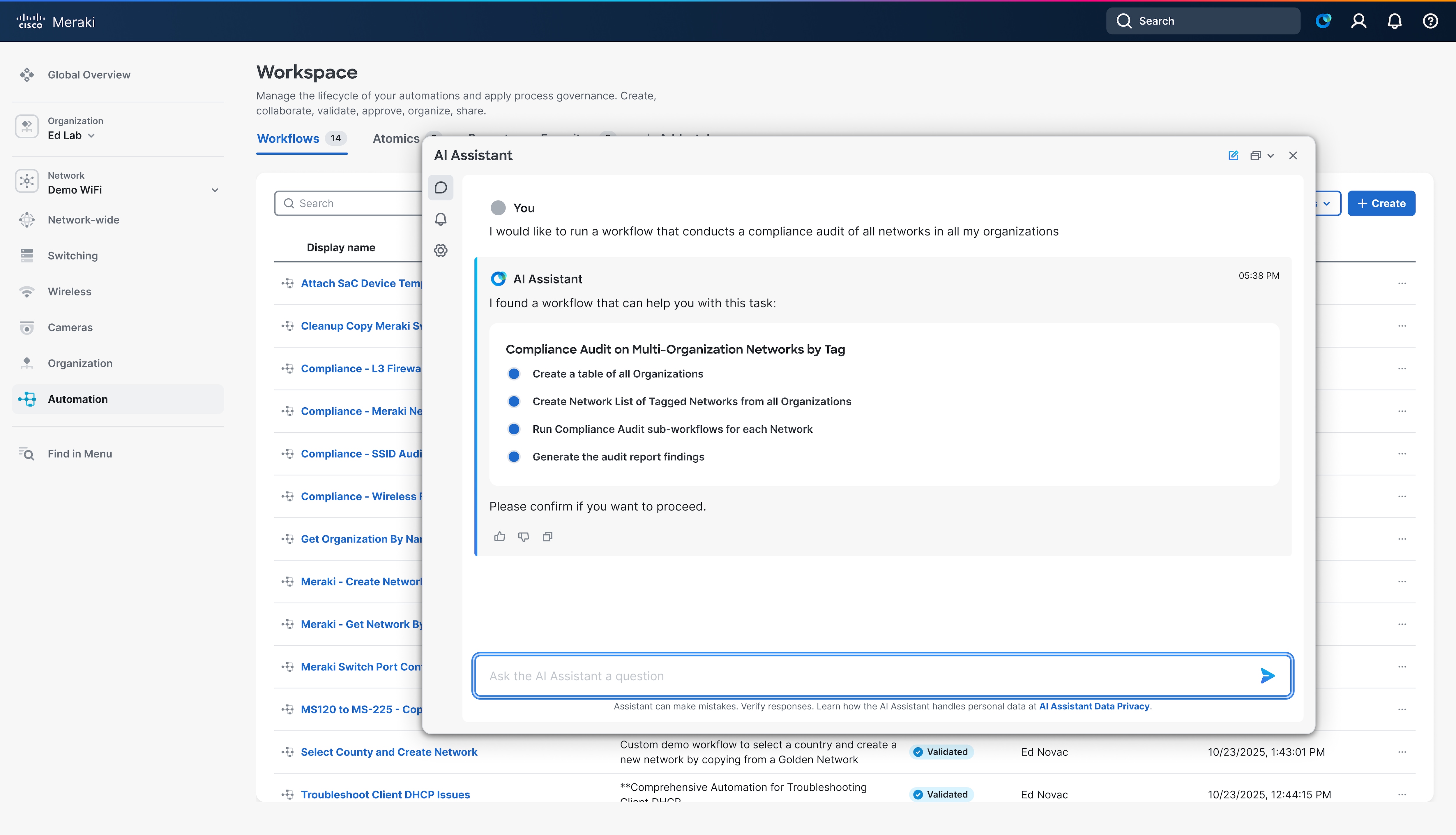 Utilisez les workflows agentiques de Cisco AI Assistant pour automatiser des tâches complexes dans Meraki, Catalyst Center, ISE et Nexus Dashboard. Effectuez vos opérations de résolution de problèmes en langage naturel pour obtenir des informations utiles et prendre de meilleures décisions, plus rapidement.